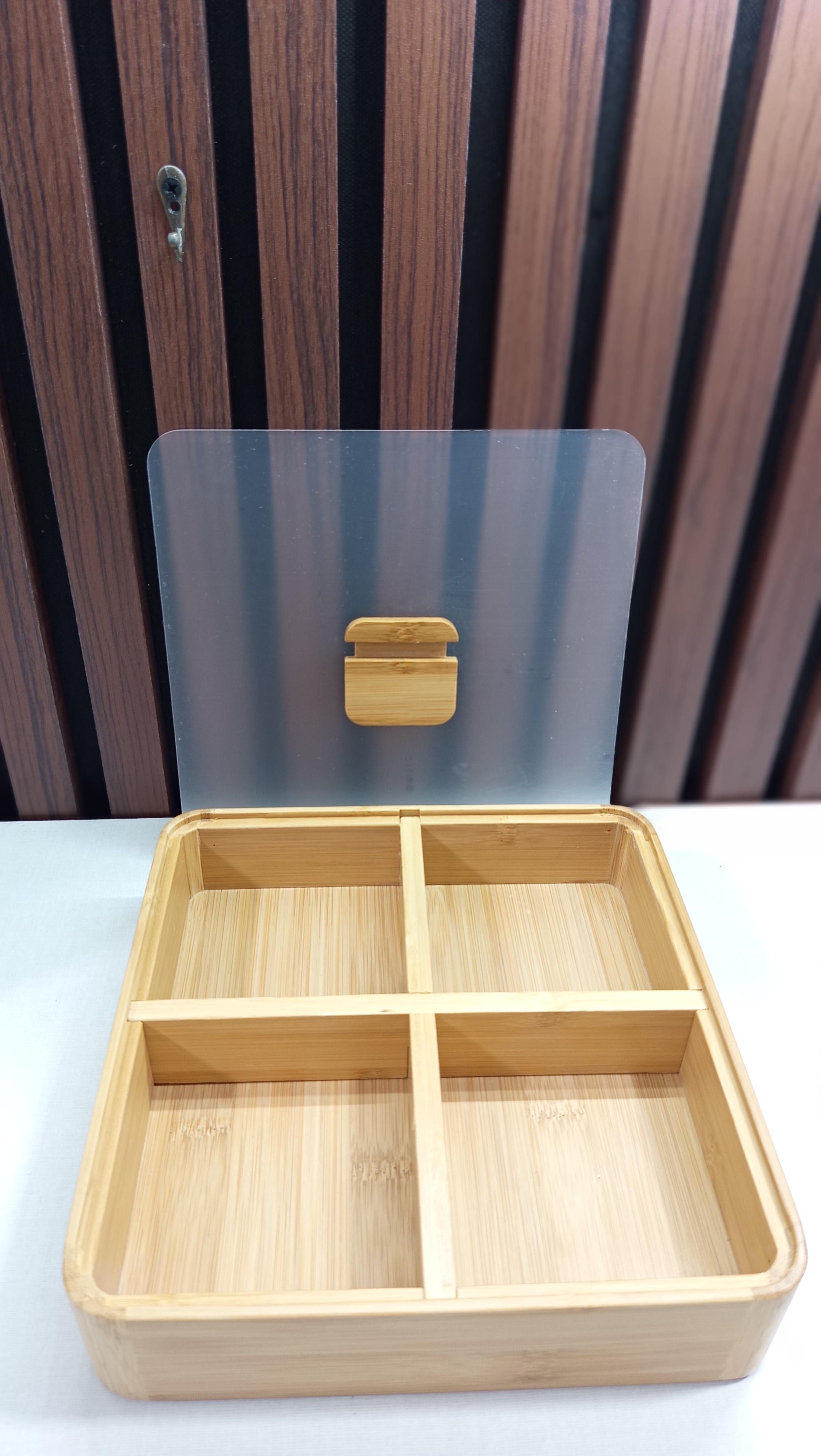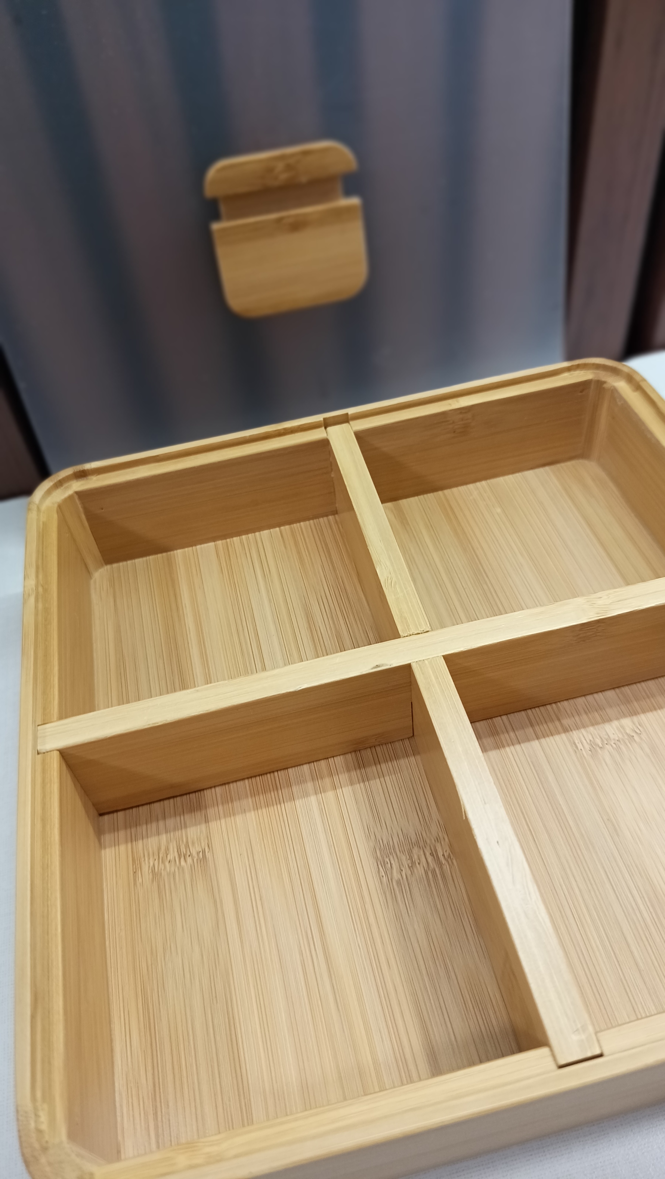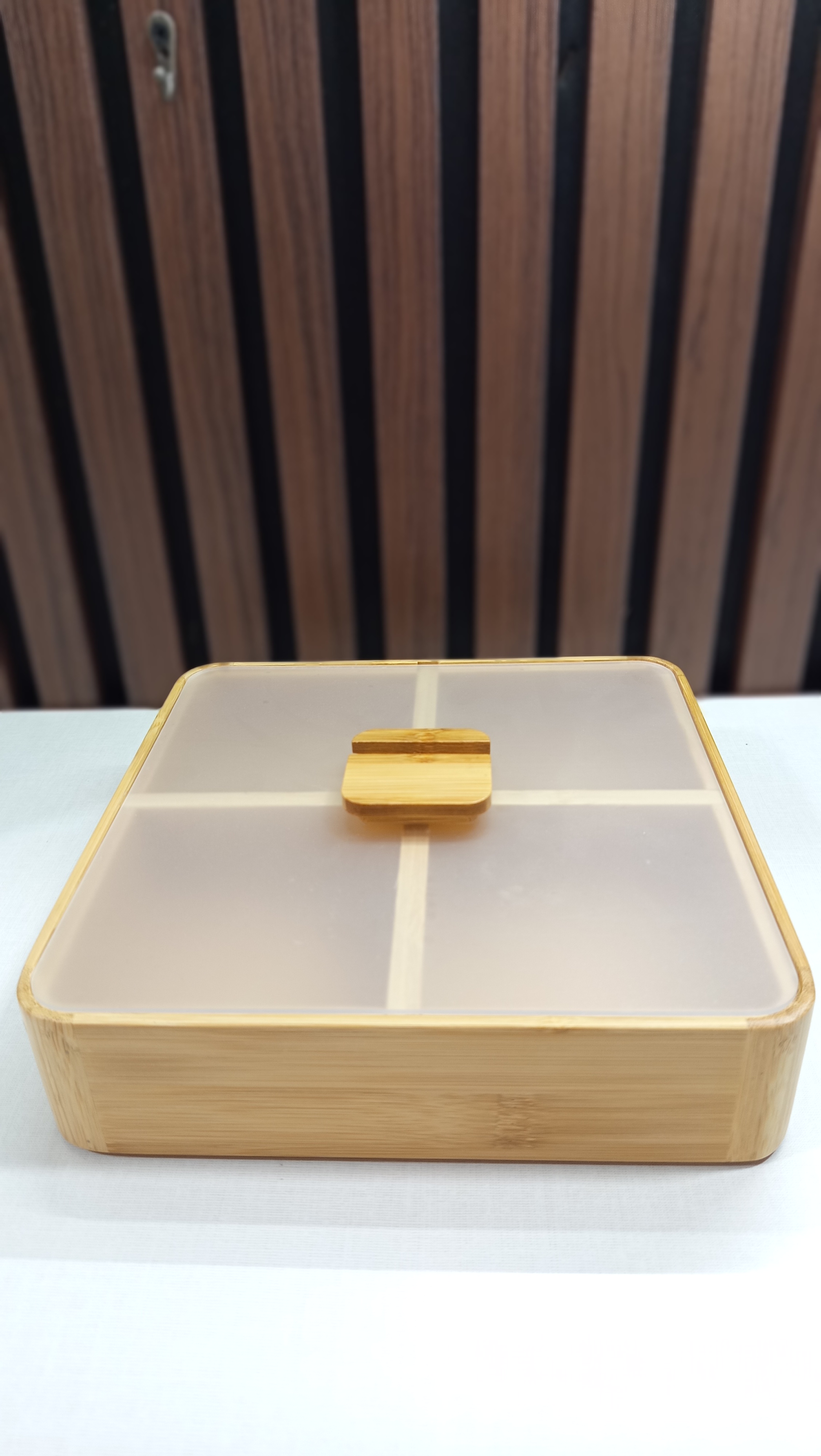 ظرف سرو چهار خانه درب دار بامبو مربع ۲۳ در ۲۳ سانت